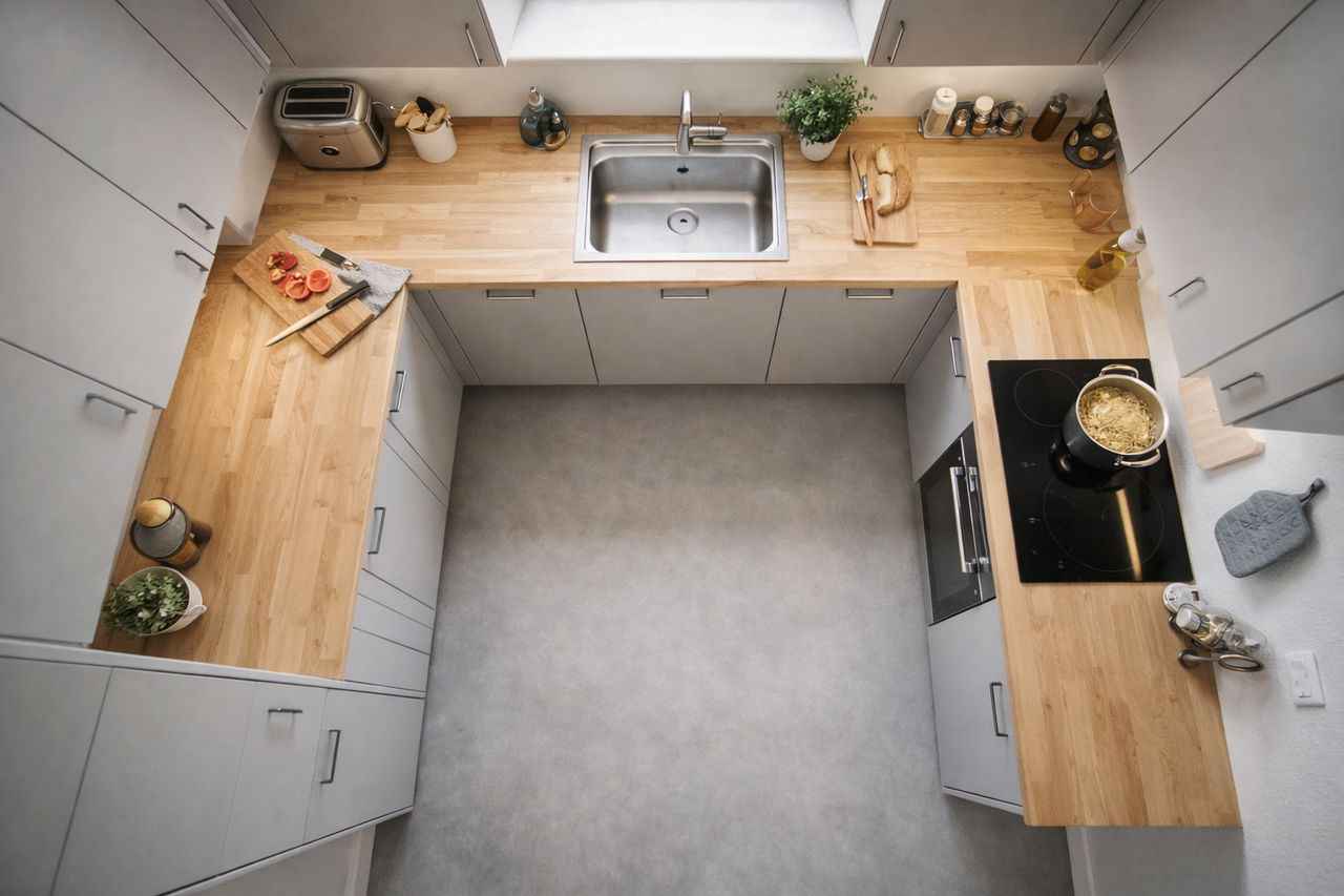 La cuisine en U s’appuie sur trois murs. Elle optimise les surfaces de travail et permet d’organiser efficacement le triangle de travail, à condition de disposer d’un passage suffisamment large. Cette conception fait un usage efficace d’un espace étroit.